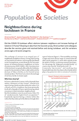 Be it in normal times or in a crisis, exchanges of services between neighbours are subject to the same laws of sociability. People in higher-level occupations make up for the geographical dispersion of their family through more frequent relations with neighbours and feel less isolated than other social categories. During the lockdown to control the spread of COVID-19, the proportion of individuals exchanging services with neighbours remained stable, but attention focused on the over-75s at the expense of families. People aged 60–74, habitually the most neighbourly age group, exchanged even more services during the crisis. In one respect, however, the lockdown produced a radical change: the exchange of services did nothing to prevent a sharp increase in the sense of isolation.