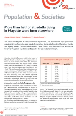 With around 23,400 inhabitants in 1958, the population of the island of Mayotte has increased by more than tenfold in the last 50 years, reaching 256,000 inhabitants in 2017. Three-quarters of children have foreign-born mothers, mostly from the Comoros. Immigration, which has long contributed to population growth, is coupled with considerable emigration, notably among young people. More than half those aged 20–24 who were born in Mayotte reside in metropolitan France, for example. What has emerged is a transformation of the population structure: more than half of adult inhabitants of the island were not born there and are from the neighbouring Comoran islands. Mayotte’s population is very young, with educational deficits. One of the island’s first challenges is thus to improve education.