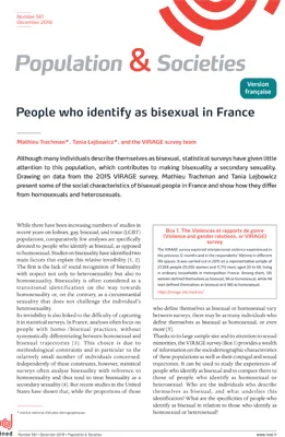 In France, 0.9% of women and 0.6% of men describe themselves as bisexual. The majority of them have engaged in sexual practices with people of both sexes (89% of men and 76% of women), and most report being more attracted to people of the other sex than to those of the same sex (58% of women and 47% of men). Identification as bisexual thus does not necessarily imply undifferentiated attraction to both sexes. The sexuality of individuals who identify as bisexual is most often directed mainly towards the other sex. Nearly half of bisexual women are below the age of 30, whereas bisexual men tend to be older; both bisexual women and men are highly likely to be single.